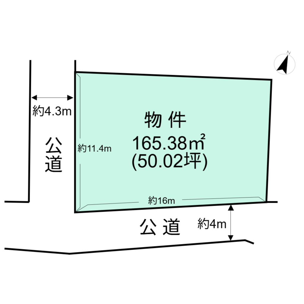 | 接道 | 南側、幅員約4mの公道に約16m接道 西側、幅員約4.3mの公道に約11.4m接道 |
